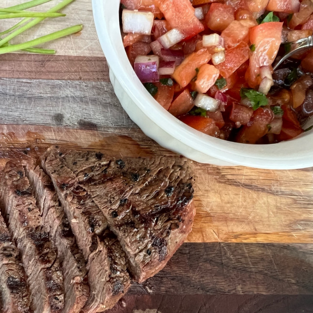 A great way to take a steak to the next level is with a steak topper. This steak topper recipe uses garden-fresh tomatoes, red onion, balsamic vinegar, fresh herbs and oil. It is a summertime family-favorite that comes together in minutes, and can be added to the top of any grilled steak.