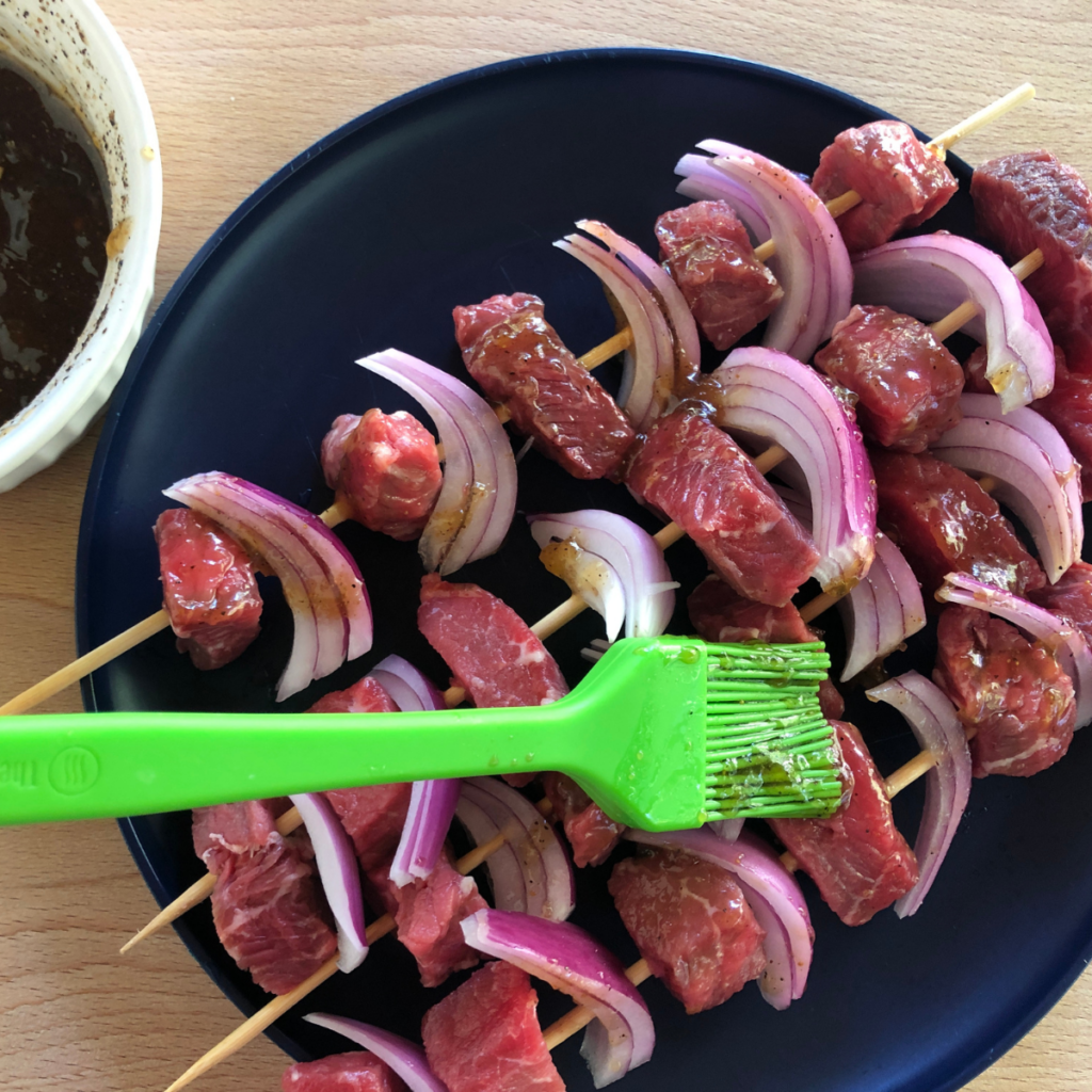 Unlike many steak kabob recipe that require you to let beef soak in a marinade with ingredients like soy sauce or worcestershire sauce, this recipe does not require marinating. Instead of marinating the meat, you create a glaze that you will brush on the beef and baste while grilling.