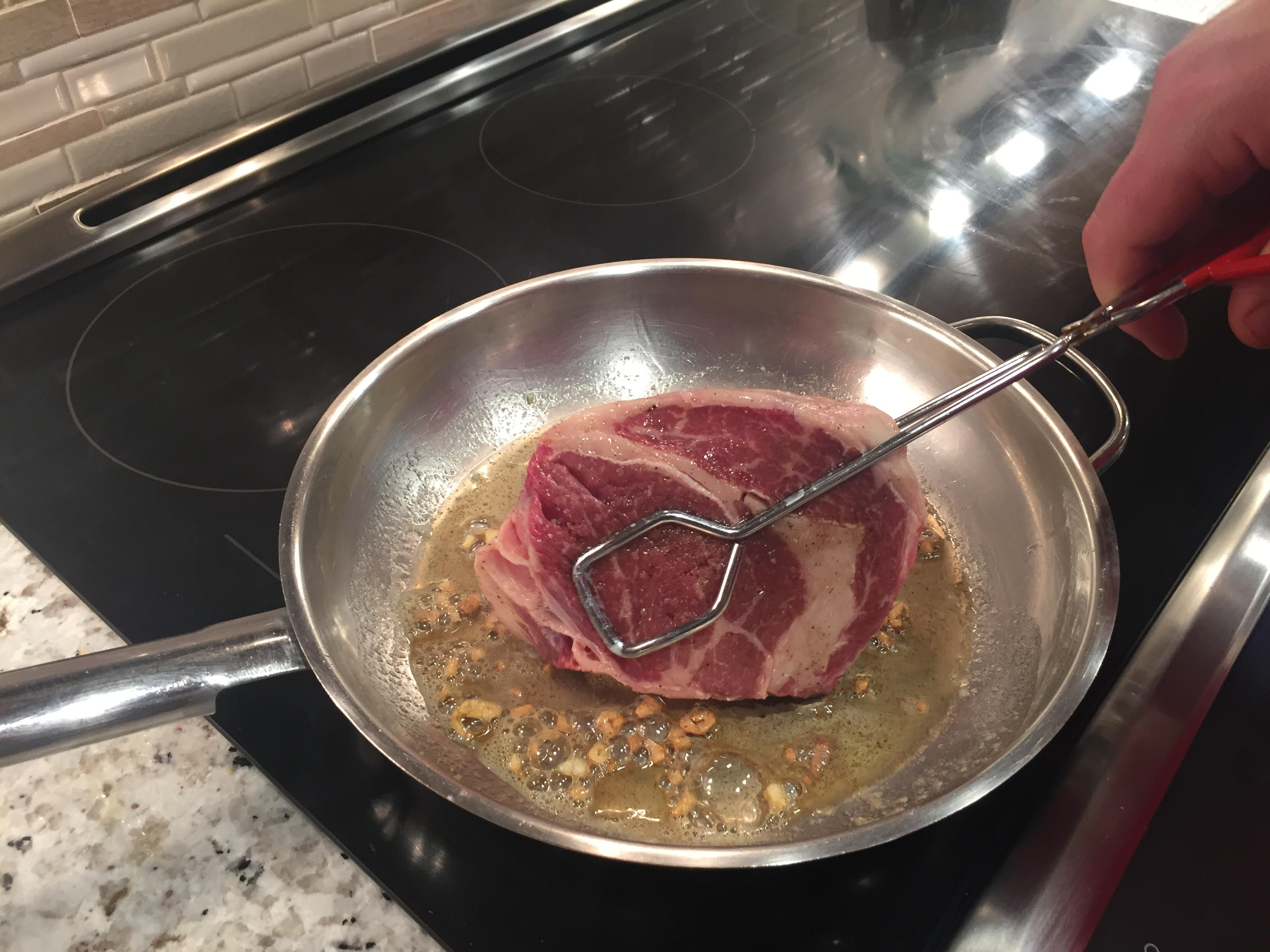 - Sear the steak for approximately 2 minutes, and then flip with the tongs.