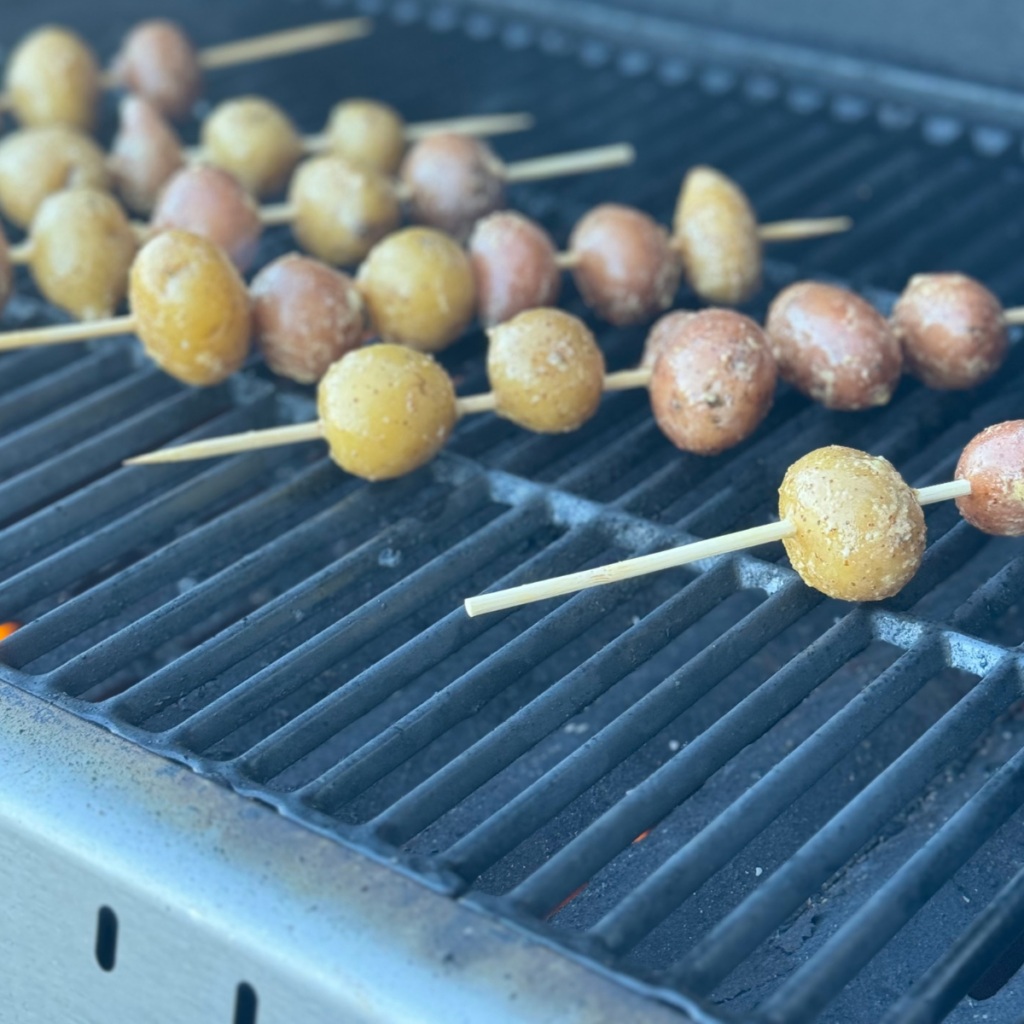In this recipe, you will skewer the potatoes and grill them. You can either use reusable skewers, or soak bamboo skewers in water for 30 minutes so the sticks don’t burn. In general, we prefer wooden skewers over metal skewers because metal skewers will cause the food to start cooking from the inside, which isn’t always ideal.