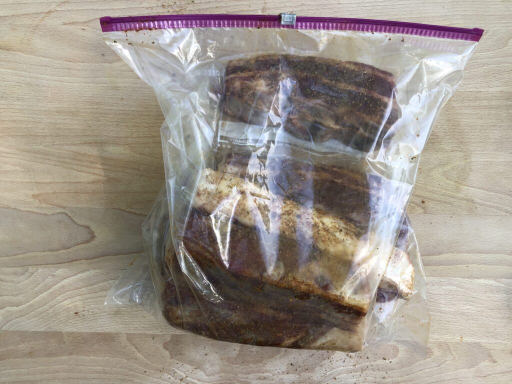 After rubbing in the dry rub thoroughly on all sides of the beef, place ribs in covered dish or Ziploc bag and refrigerate for 2-4 hours.