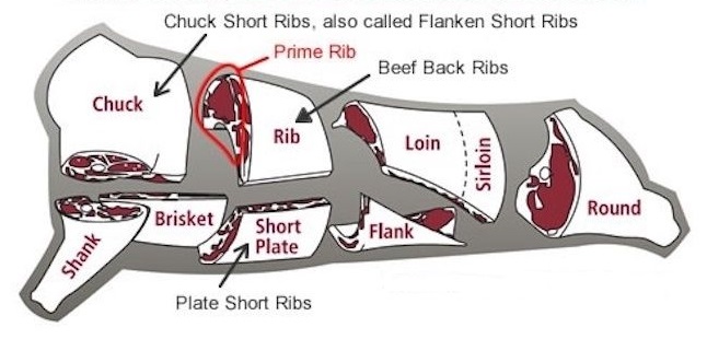 On a steer, there are 13 pairs of ribs and they come from three different primal sections: short plate, rib and chuck. It’s easiest to see where the three primal sections are located on a beef cut chart.