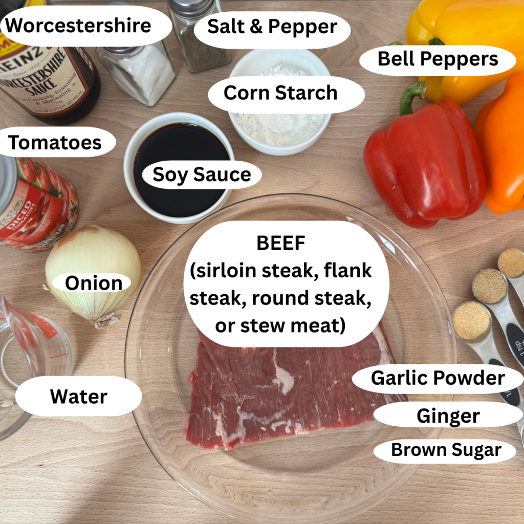 - 2 pounds Sirloin steak, flank steak or stew meat* cut into 2 inch slices